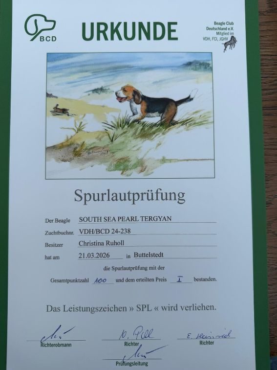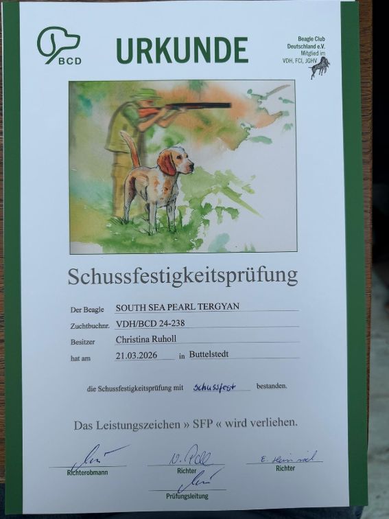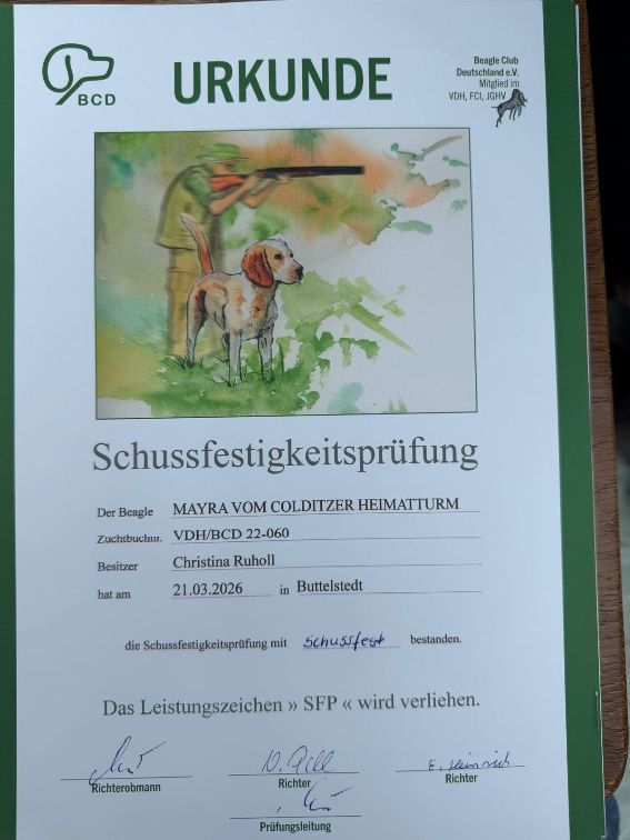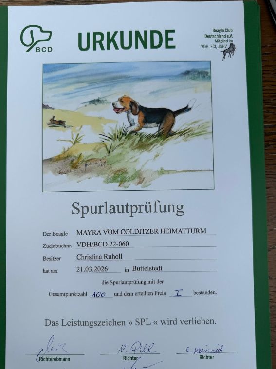 Am 21.03.2026 fanden in Hemleben (Thüringen) BCD Schussfestigkeits- und Spurlautprüfungen (SFP und SPL) statt. Paula "South Sea Pearl Tergyan" und Martha "Mayra vom Colditzer Heimatturm" nahmen teil und bestanden mit 100 Punkten. Paula wurde Tagessiegerin. Herzliche Glückwünsche an Familie Ruholl.